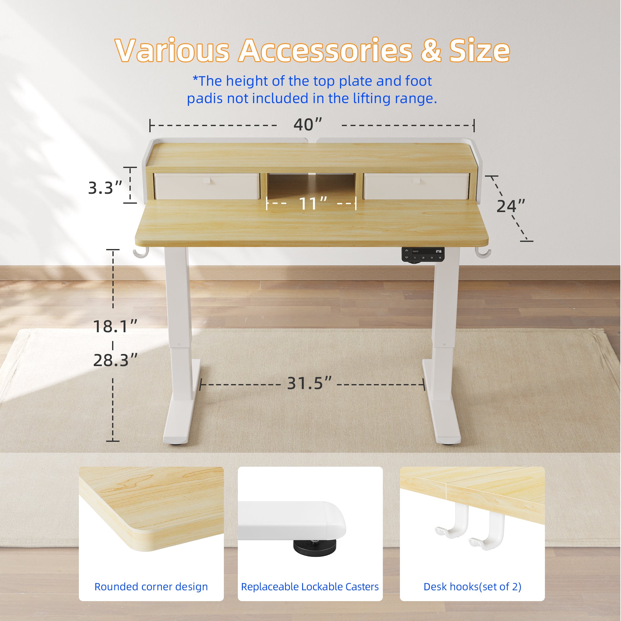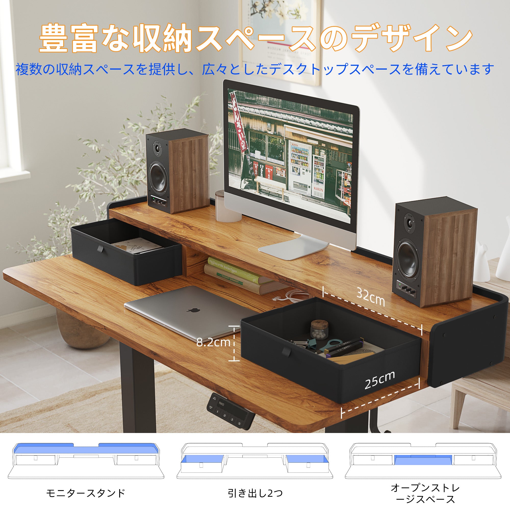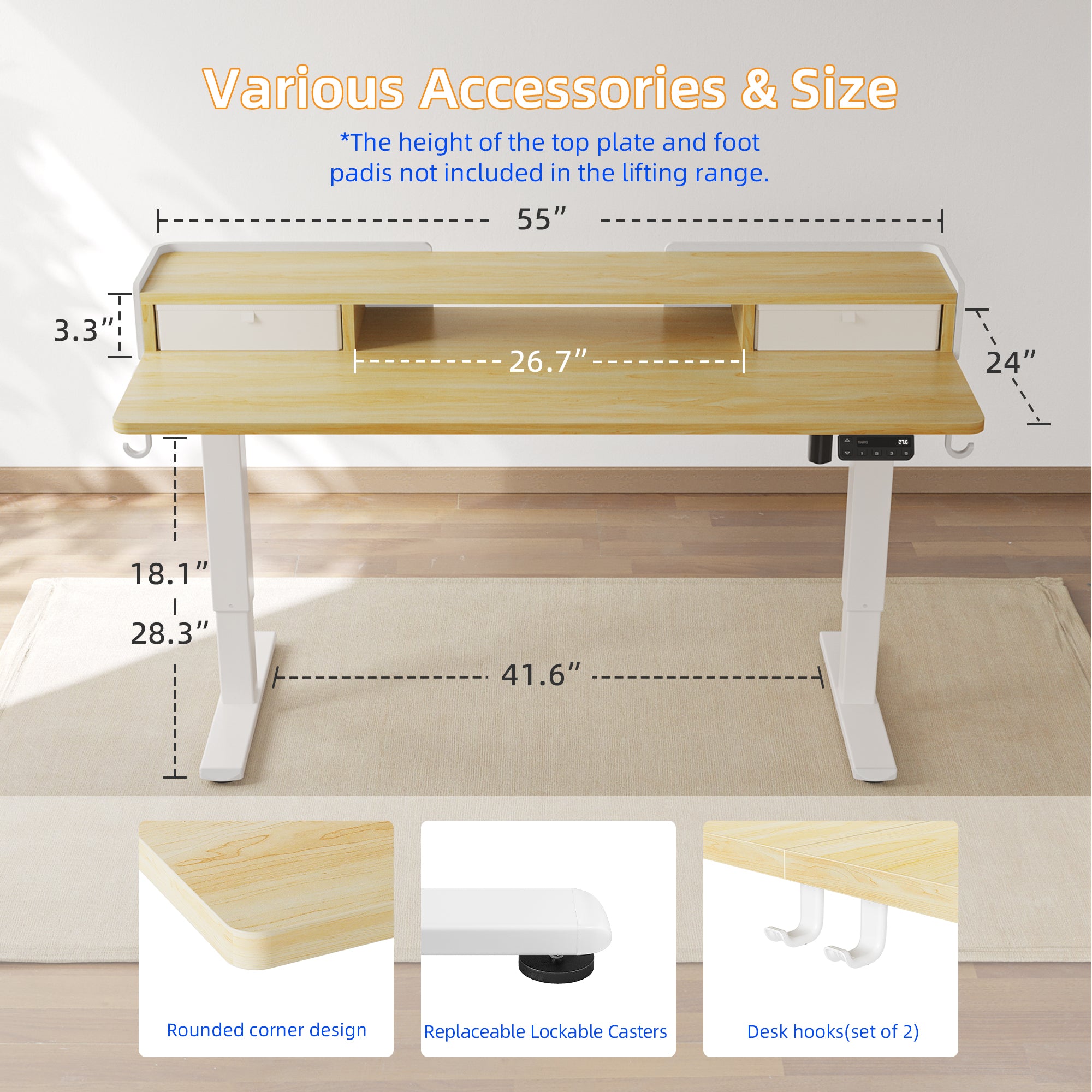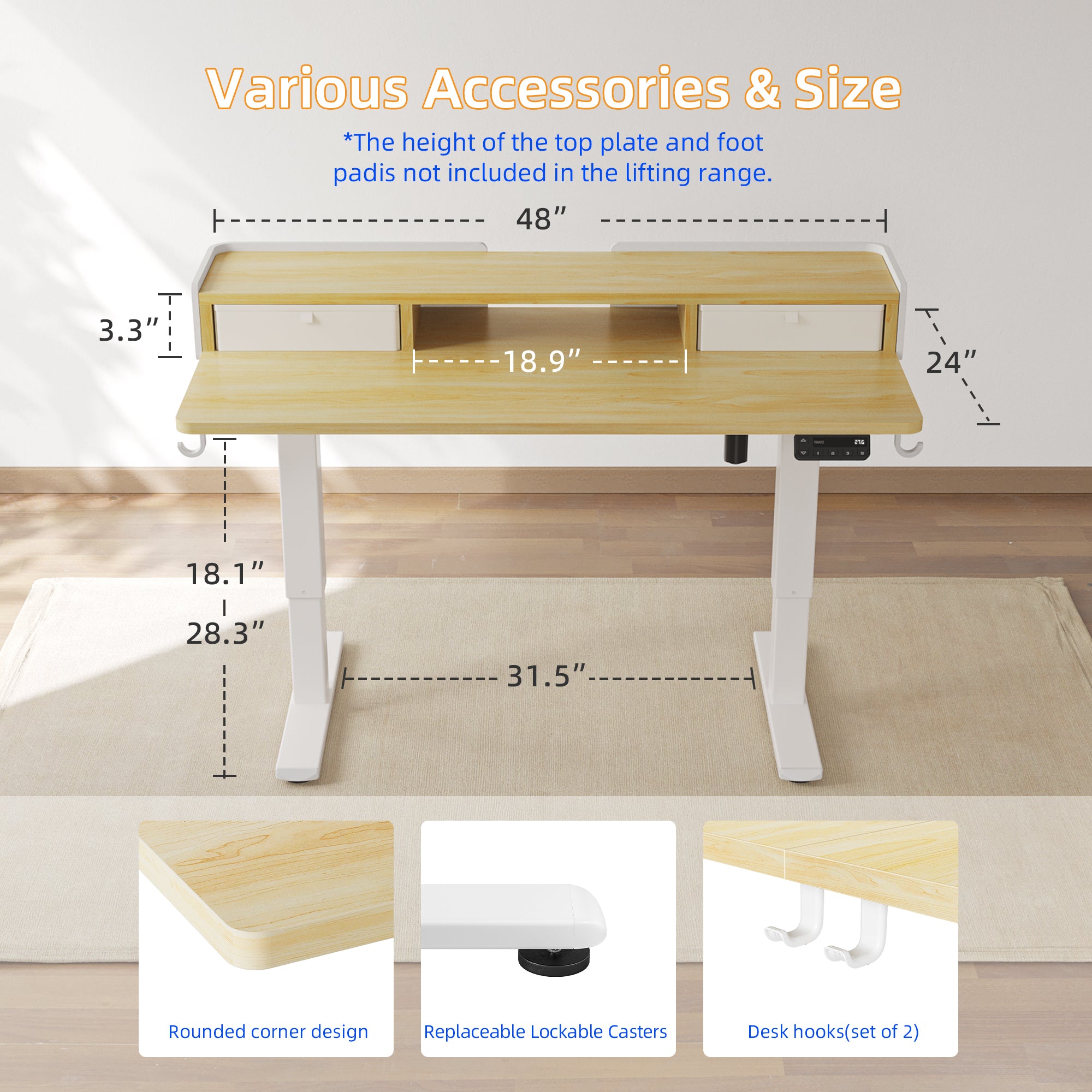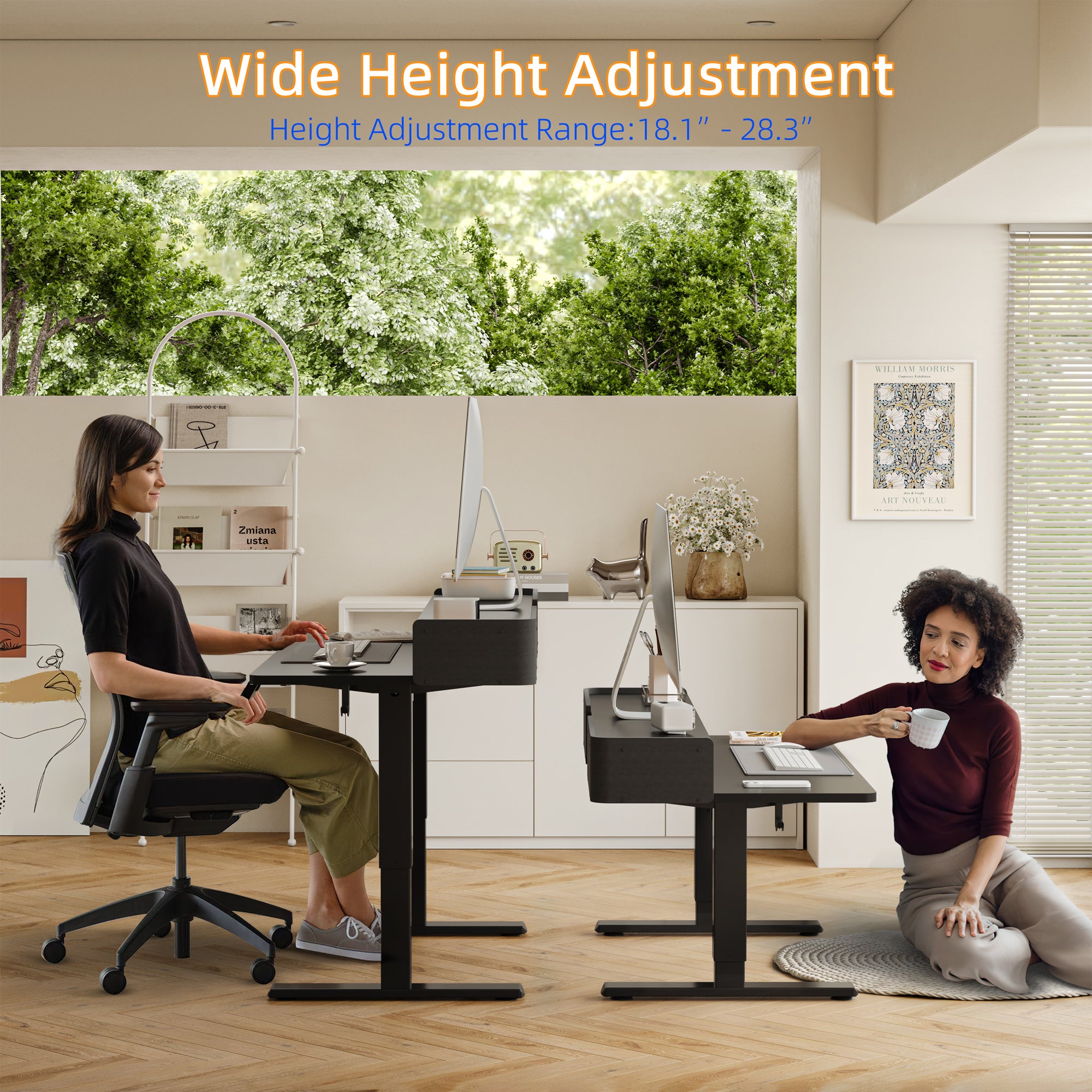 YIHAYO electric sit-stand desk has a monitor stand for your monitor and other devices, allowing you to keep your eyes parallel to the screen, helping to reduce neck and back pressure. Two fabric drawers provide ample storage space for your belongings, allowing you to store files, books, cables, etc., helping to keep your desk tidy and organized. This sit-stand desk is also equipped with a headphone hook and desktop cable storage hole to create an organized workspace.
