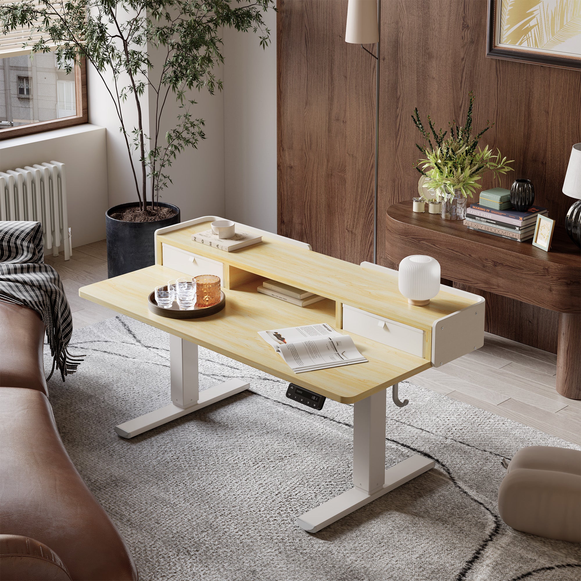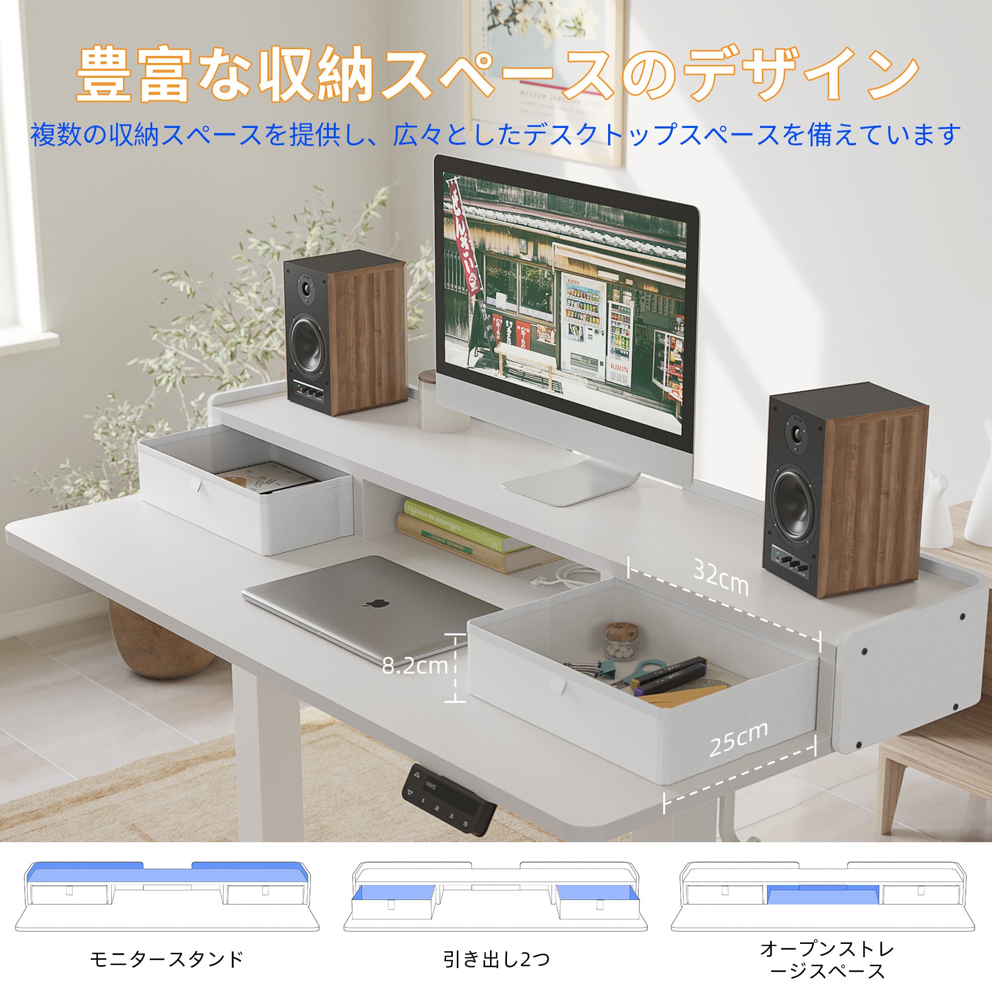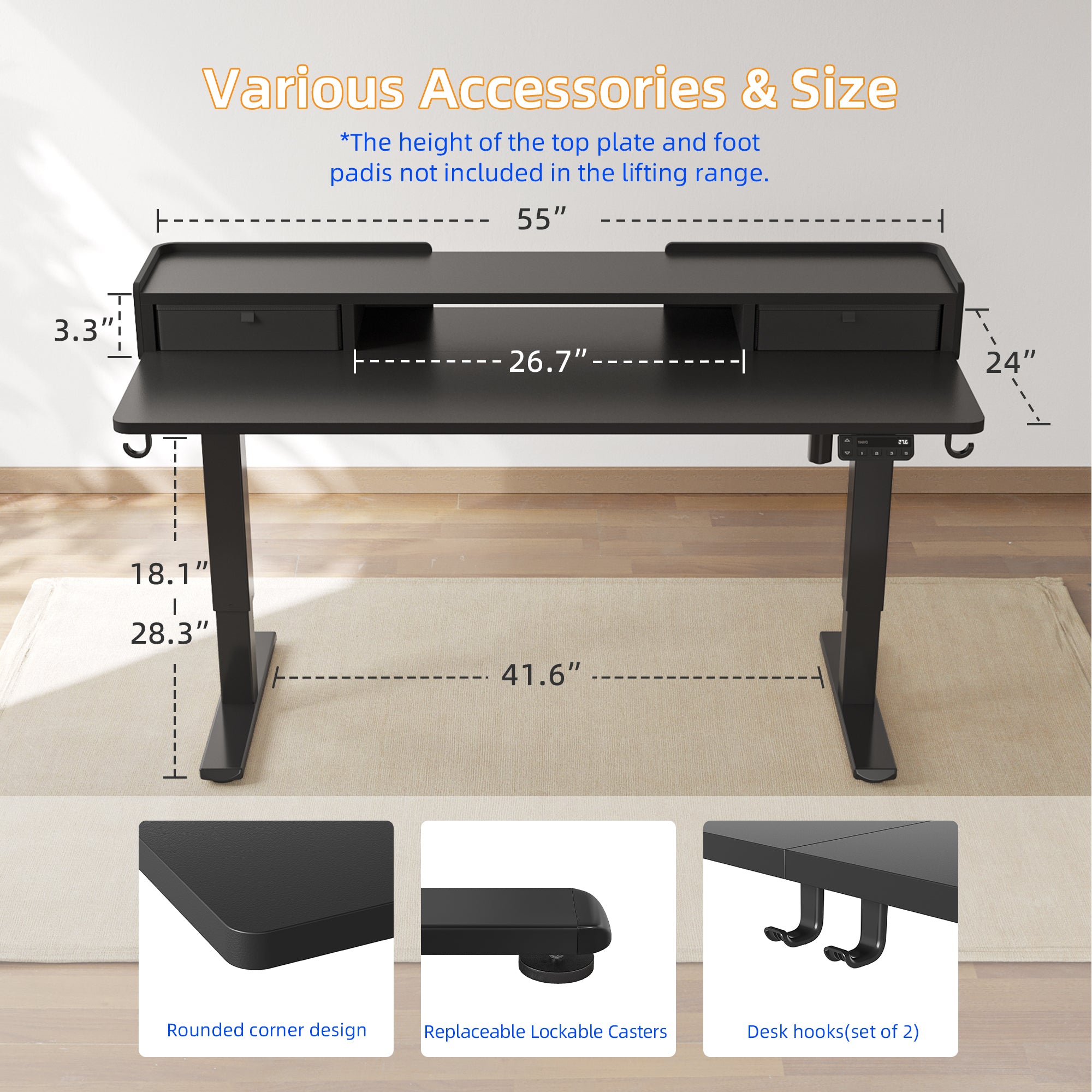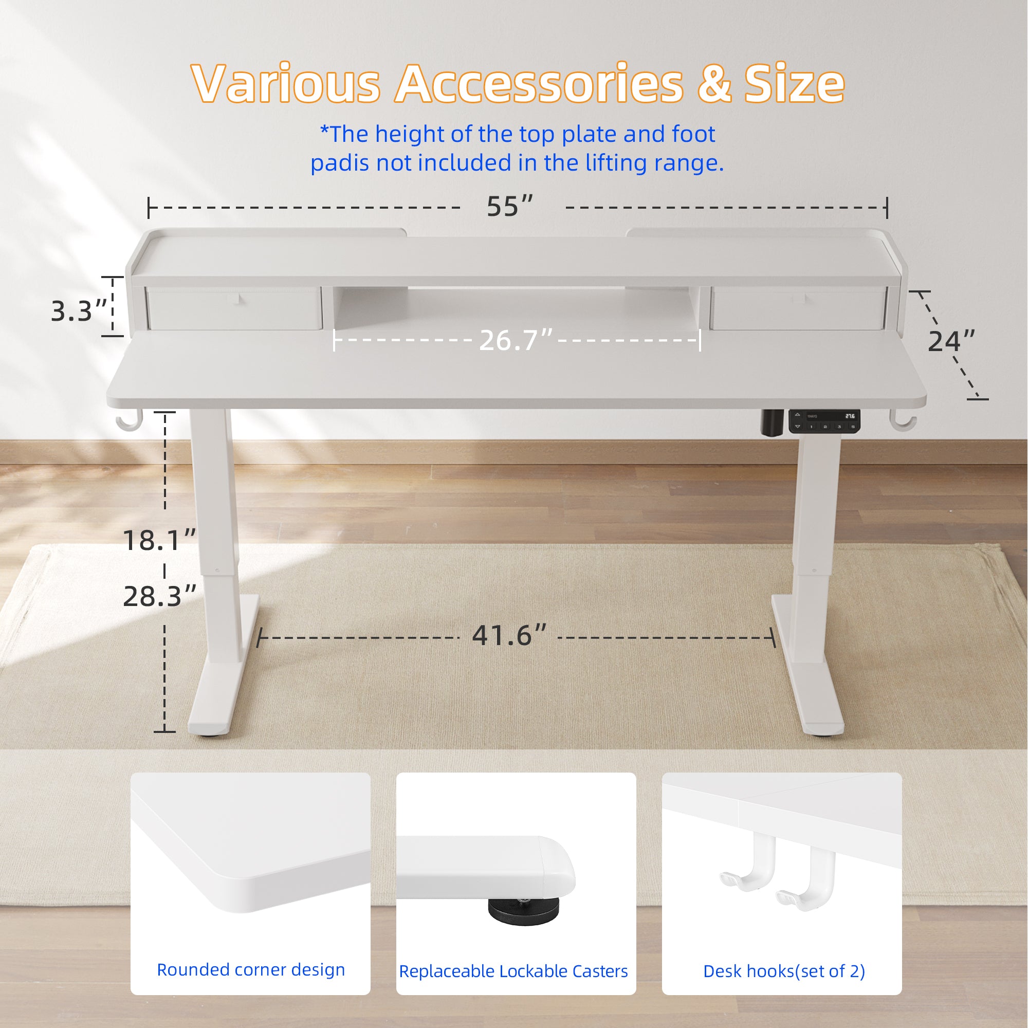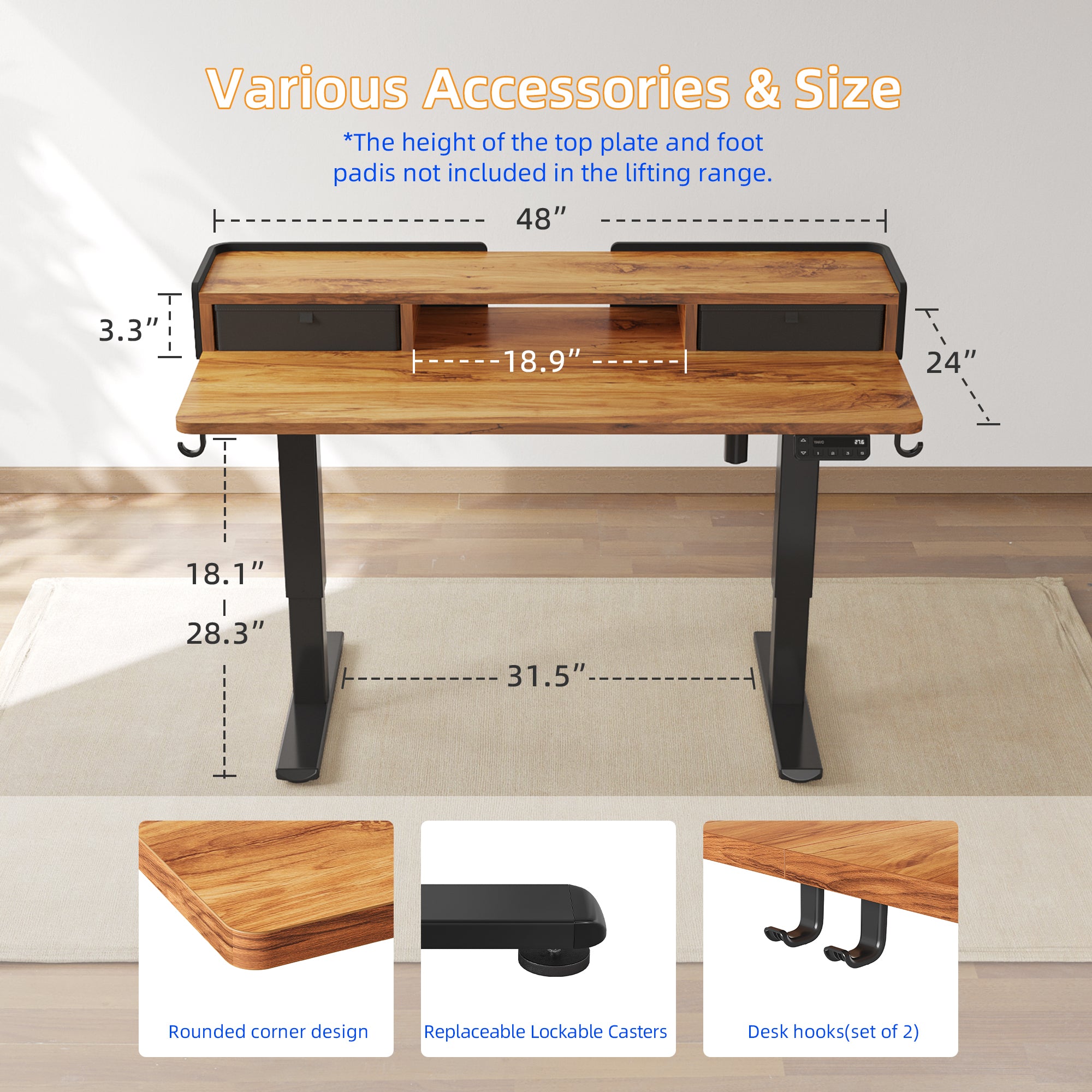 YIHAYO electric sit-stand desk has a monitor stand for your monitor and other devices, allowing you to keep your eyes parallel to the screen, helping to reduce neck and back pressure. Two fabric drawers provide ample storage space for your belongings, allowing you to store files, books, cables, etc., helping to keep your desk tidy and organized. This sit-stand desk is also equipped with a headphone hook and desktop cable storage hole to create an organized workspace.