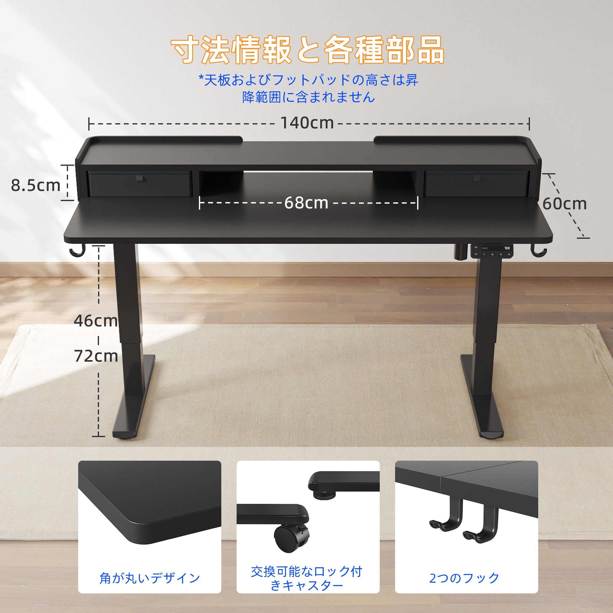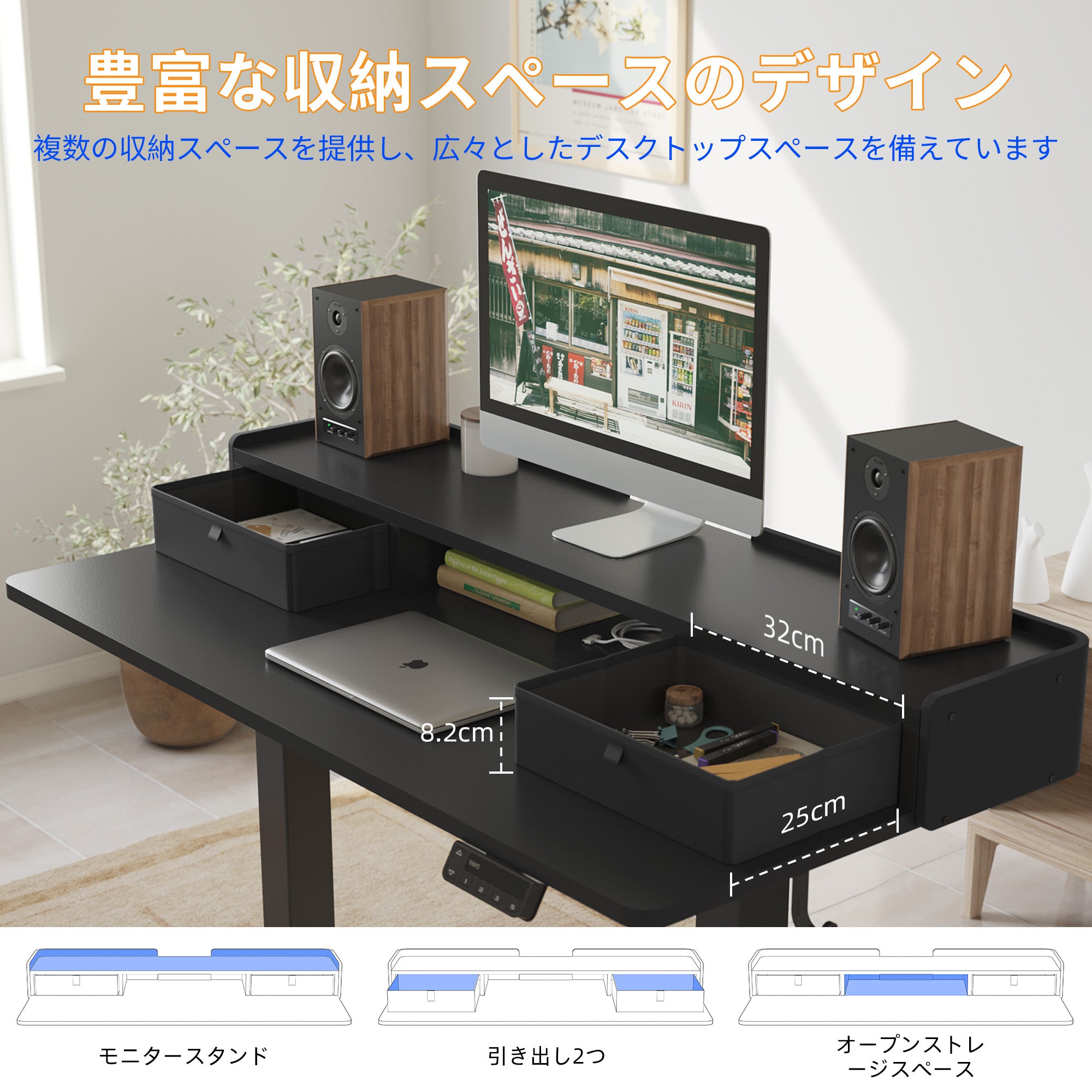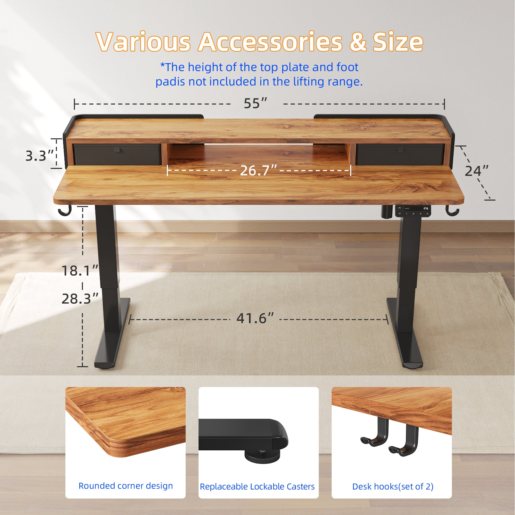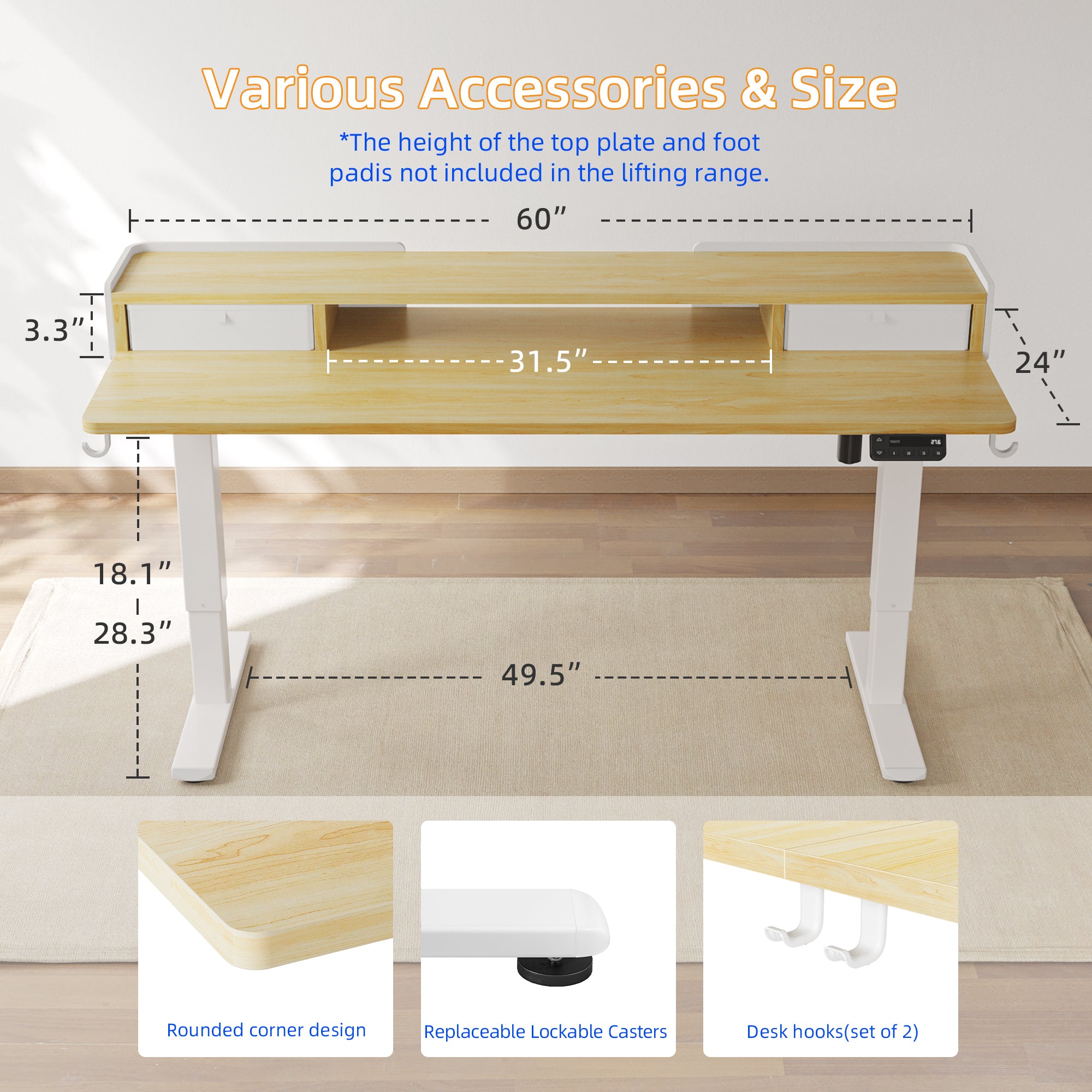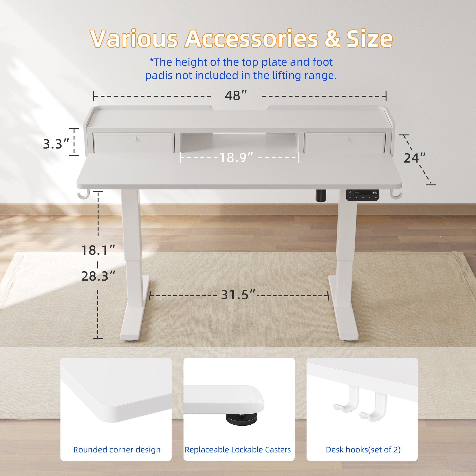 YIHAYO electric sit-stand desk has a monitor stand for your monitor and other devices, allowing you to keep your eyes parallel to the screen, helping to reduce neck and back pressure. Two fabric drawers provide ample storage space for your belongings, allowing you to store files, books, cables, etc., helping to keep your desk tidy and organized. This sit-stand desk is also equipped with a headphone hook and desktop cable storage hole to create an organized workspace.
