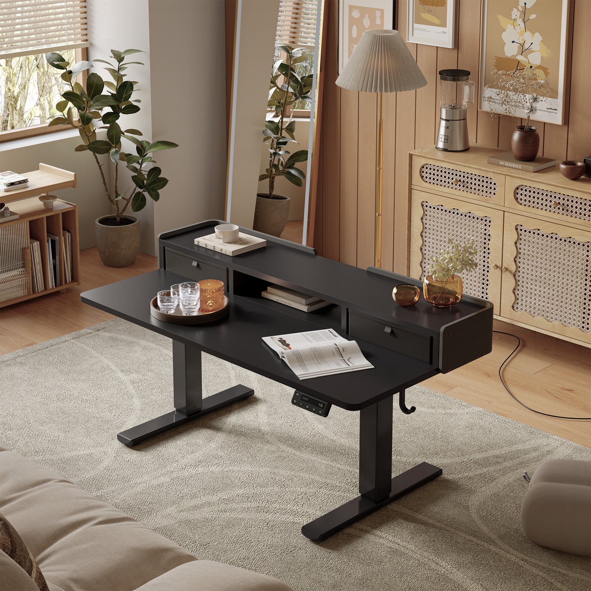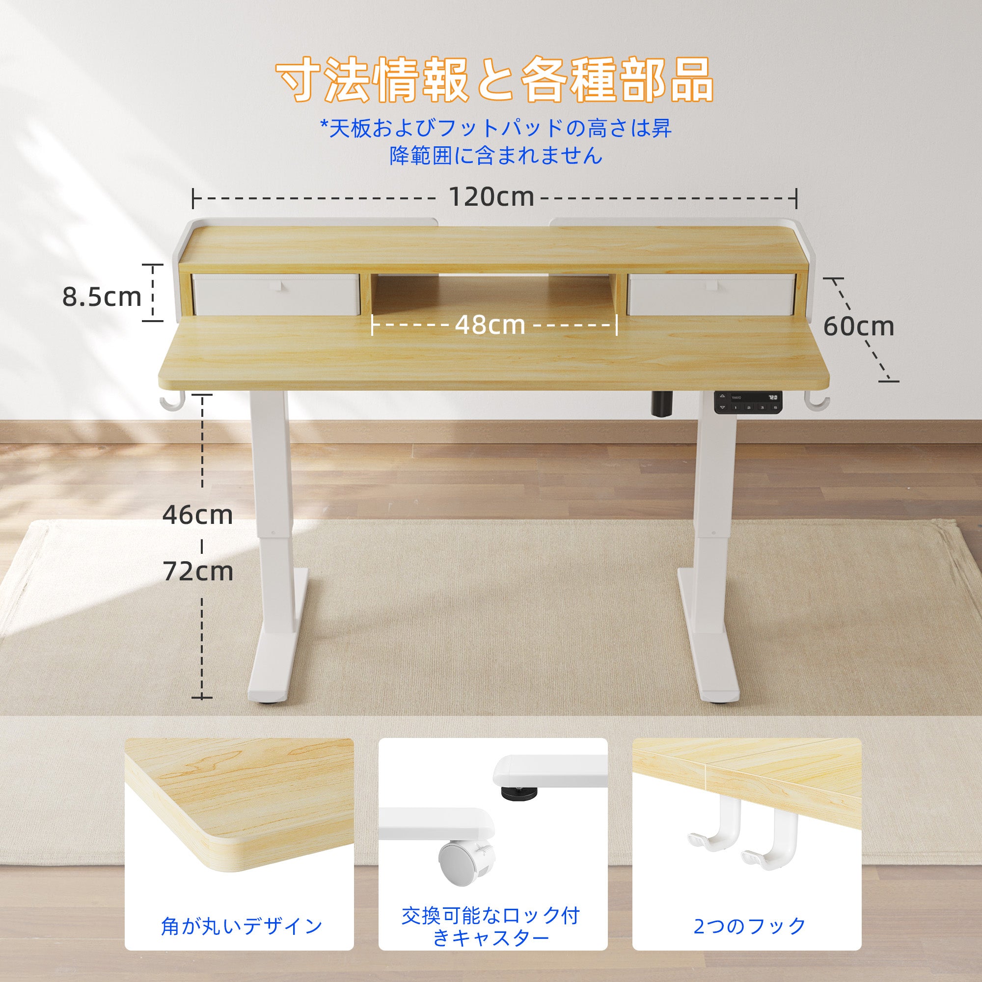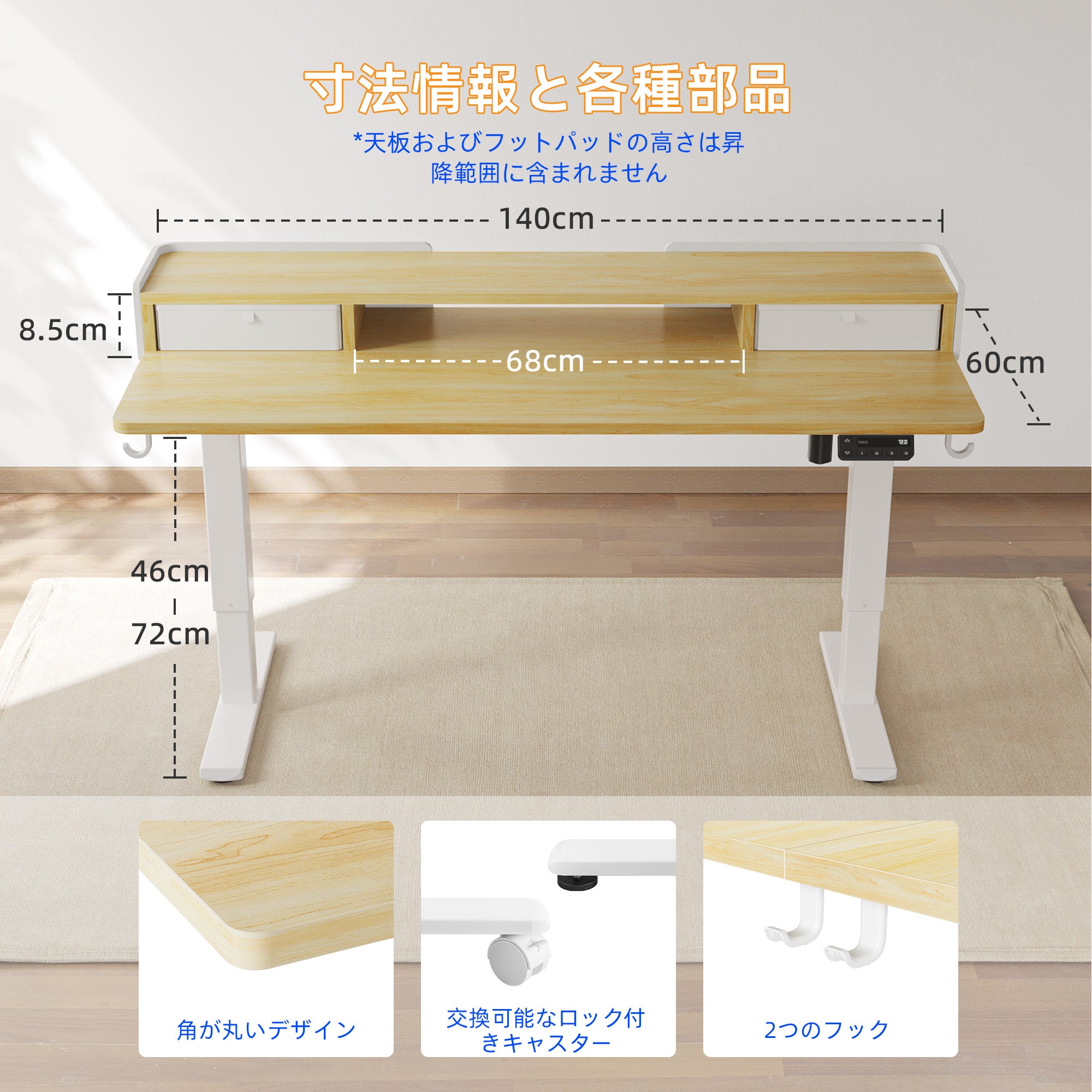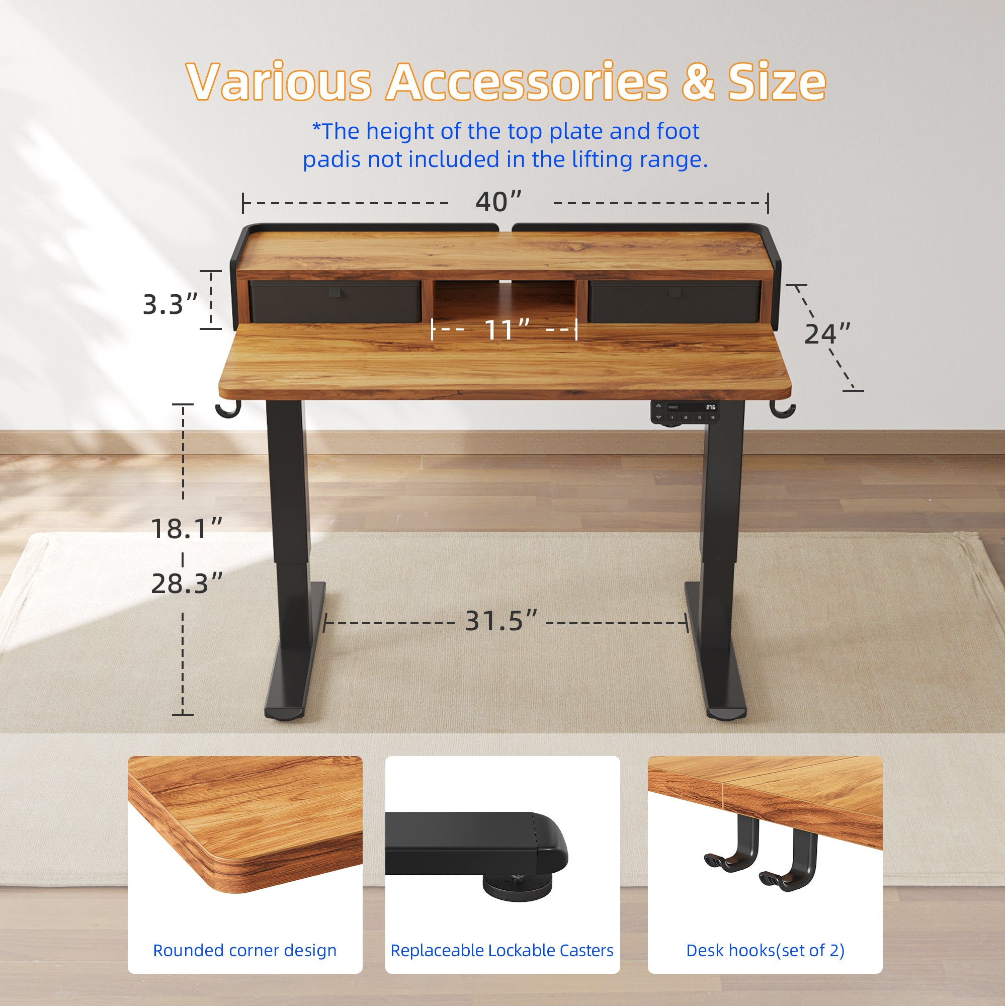 YIHAYO electric sit-stand desk has a monitor stand for your monitor and other devices, allowing you to keep your eyes parallel to the screen, helping to reduce neck and back pressure. Two fabric drawers provide ample storage space for your belongings, allowing you to store files, books, cables, etc., helping to keep your desk tidy and organized. This sit-stand desk is also equipped with a headphone hook and desktop cable storage hole to create an organized workspace.