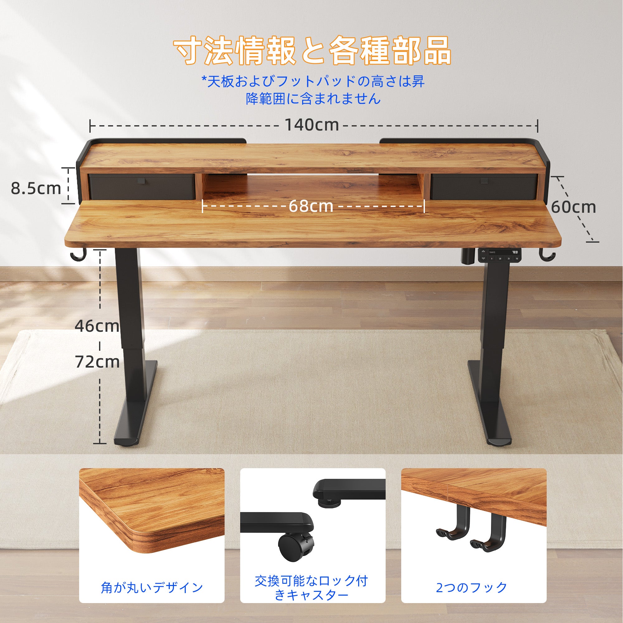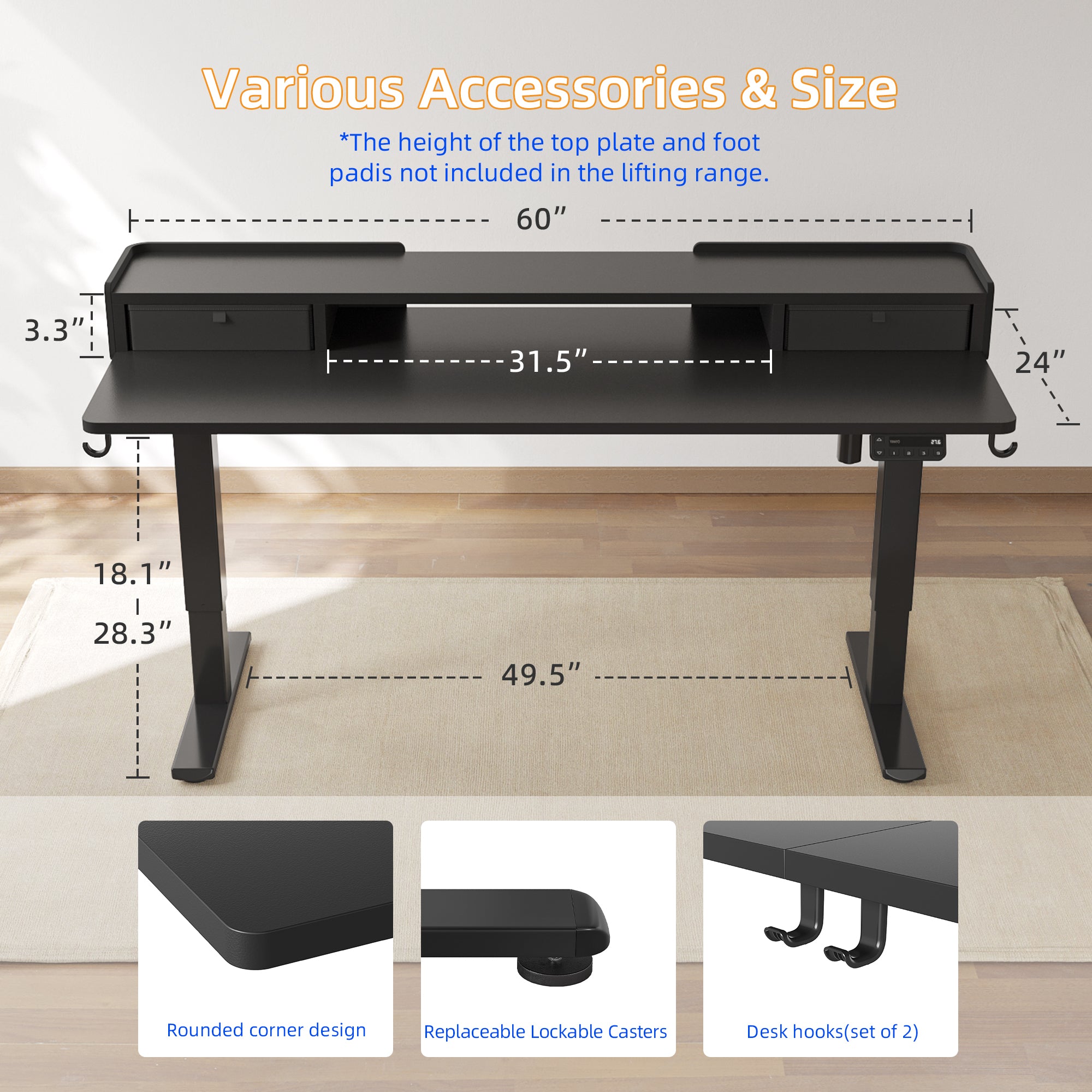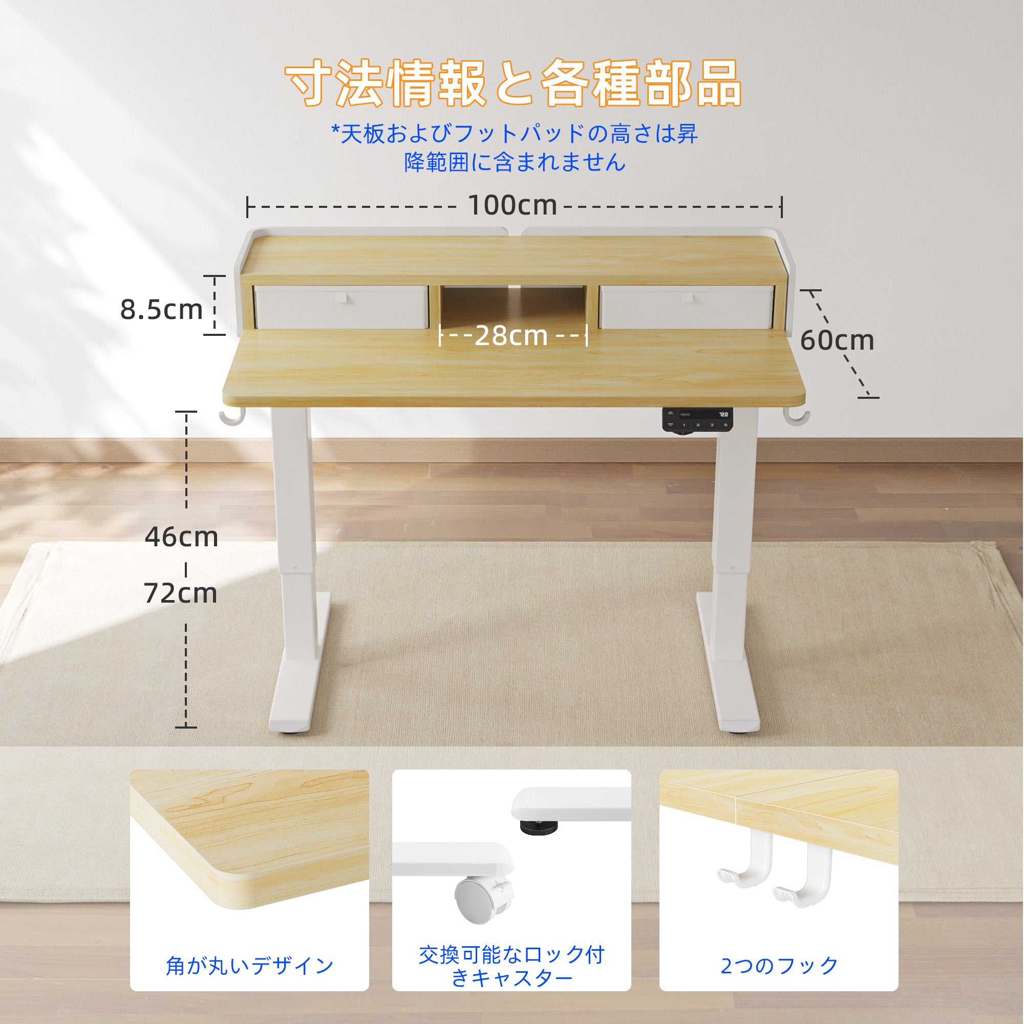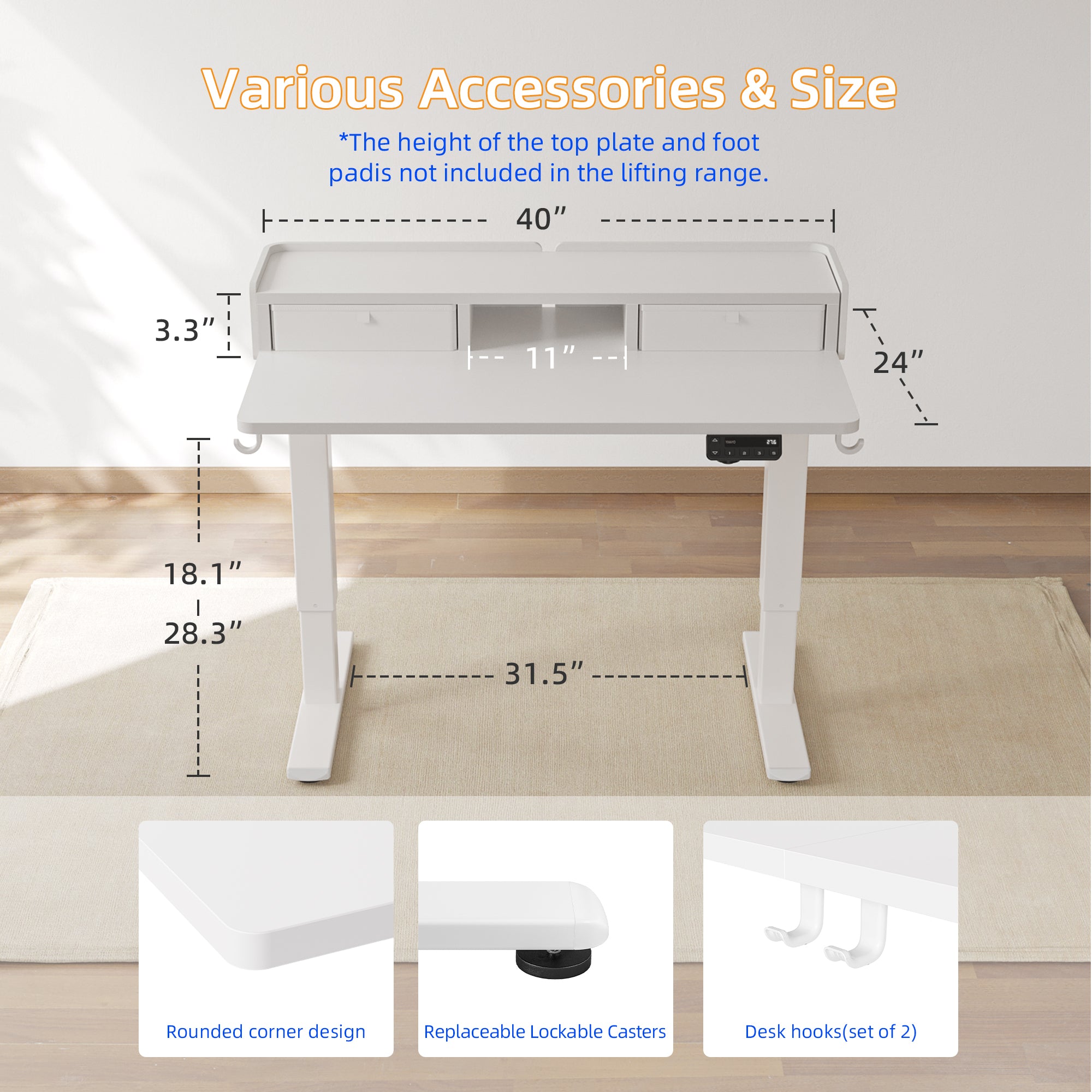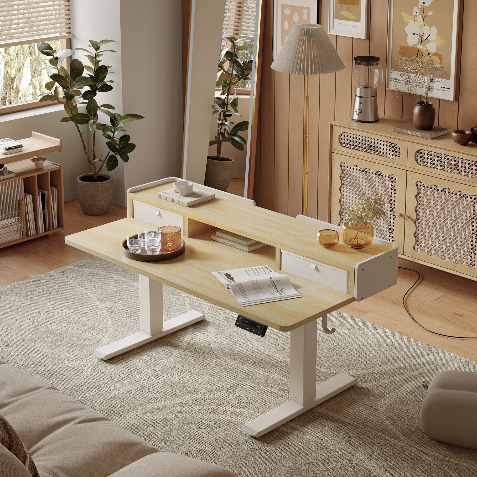 YIHAYO electric sit-stand desk has a monitor stand for your monitor and other devices, allowing you to keep your eyes parallel to the screen, helping to reduce neck and back pressure. Two fabric drawers provide ample storage space for your belongings, allowing you to store files, books, cables, etc., helping to keep your desk tidy and organized. This sit-stand desk is also equipped with a headphone hook and desktop cable storage hole to create an organized workspace.