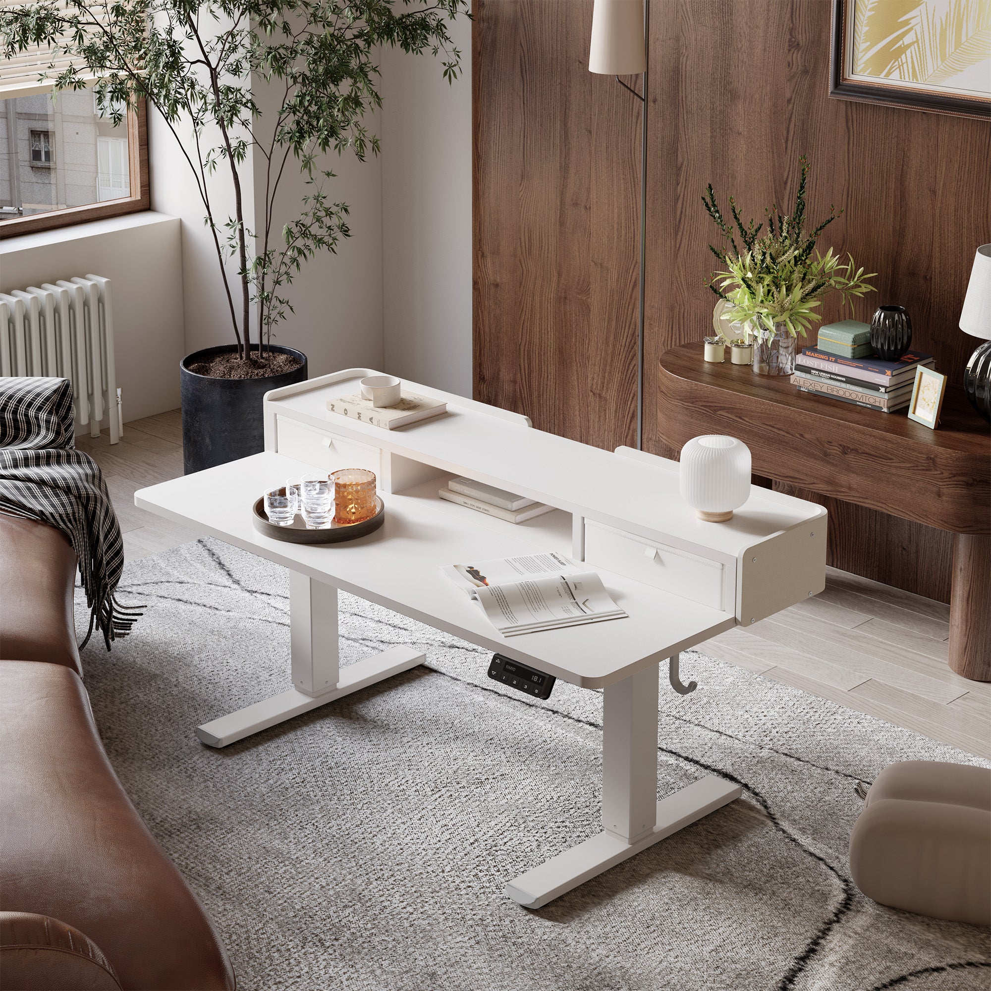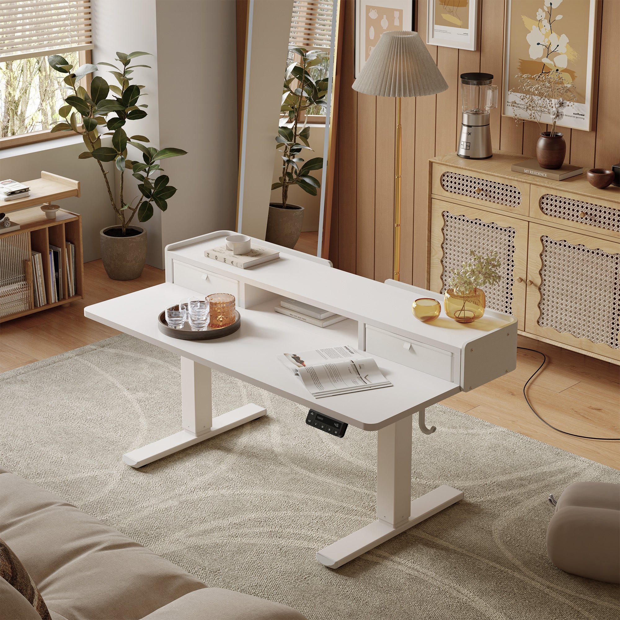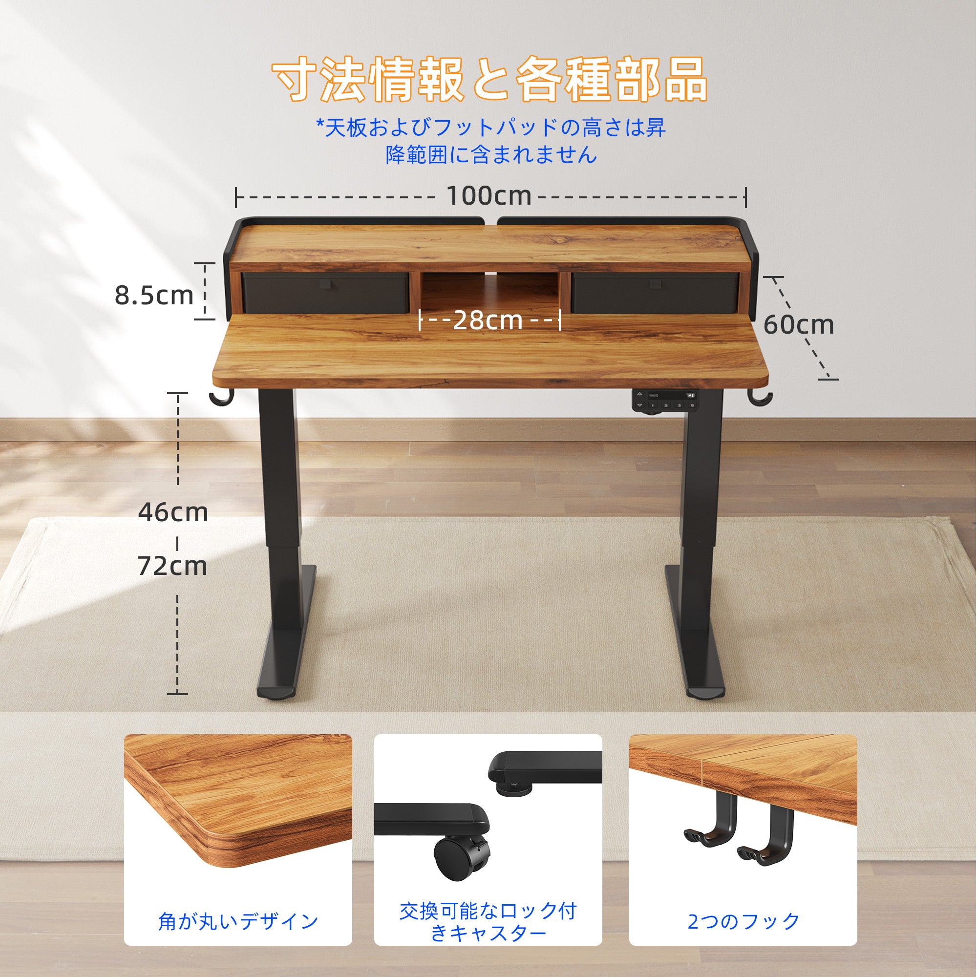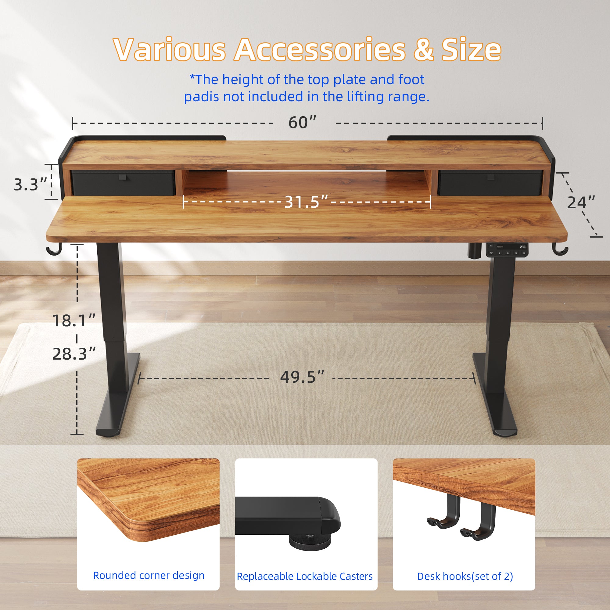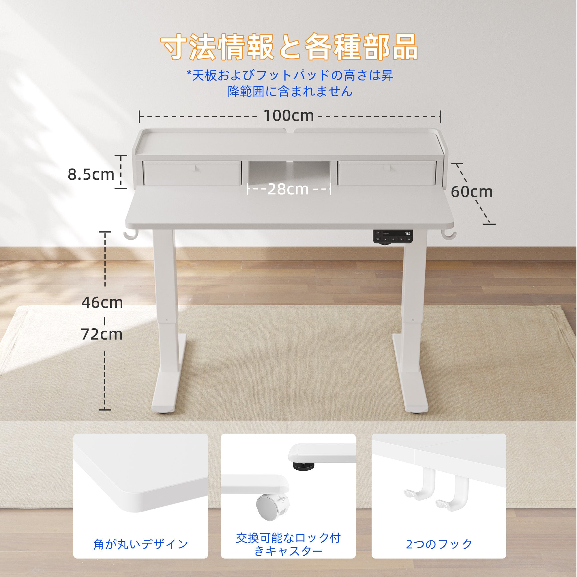 YIHAYO electric sit-stand desk has a monitor stand for your monitor and other devices, allowing you to keep your eyes parallel to the screen, helping to reduce neck and back pressure. Two fabric drawers provide ample storage space for your belongings, allowing you to store files, books, cables, etc., helping to keep your desk tidy and organized. This sit-stand desk is also equipped with a headphone hook and desktop cable storage hole to create an organized workspace.