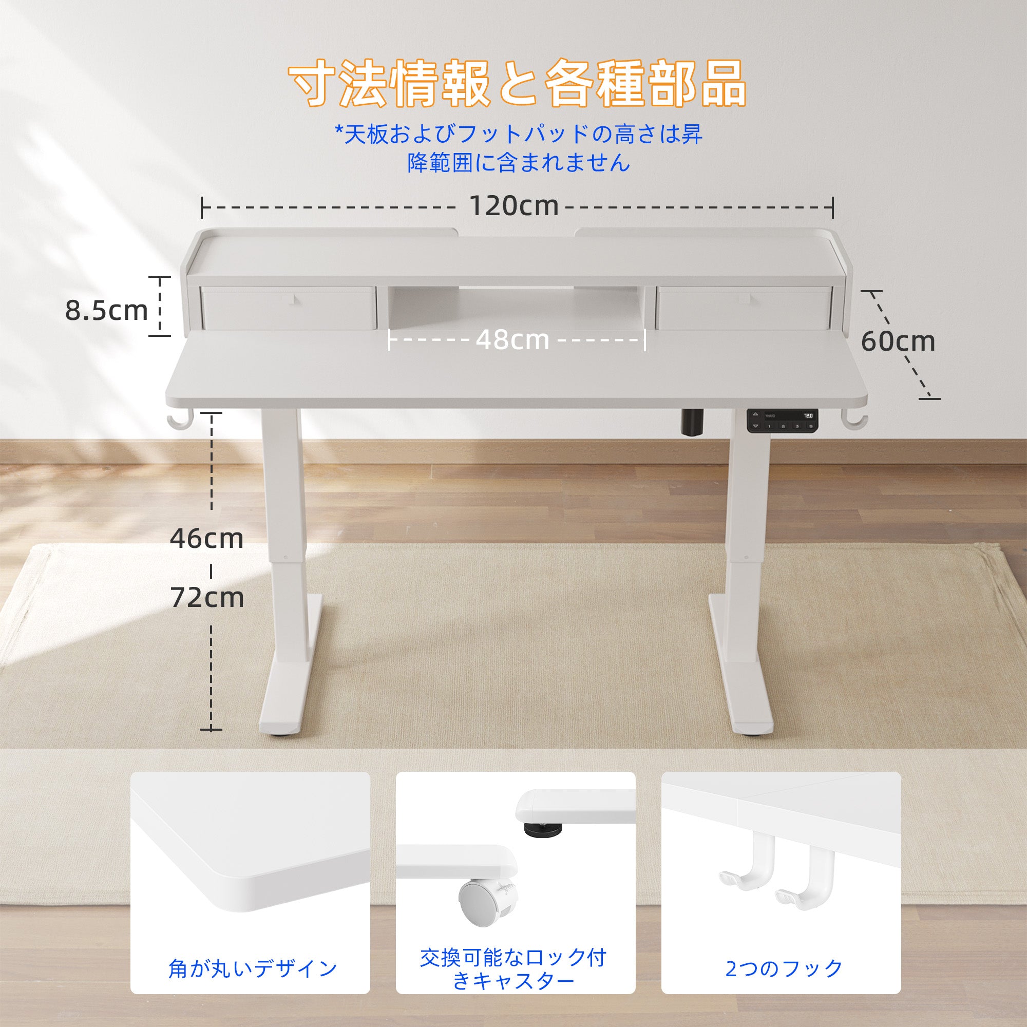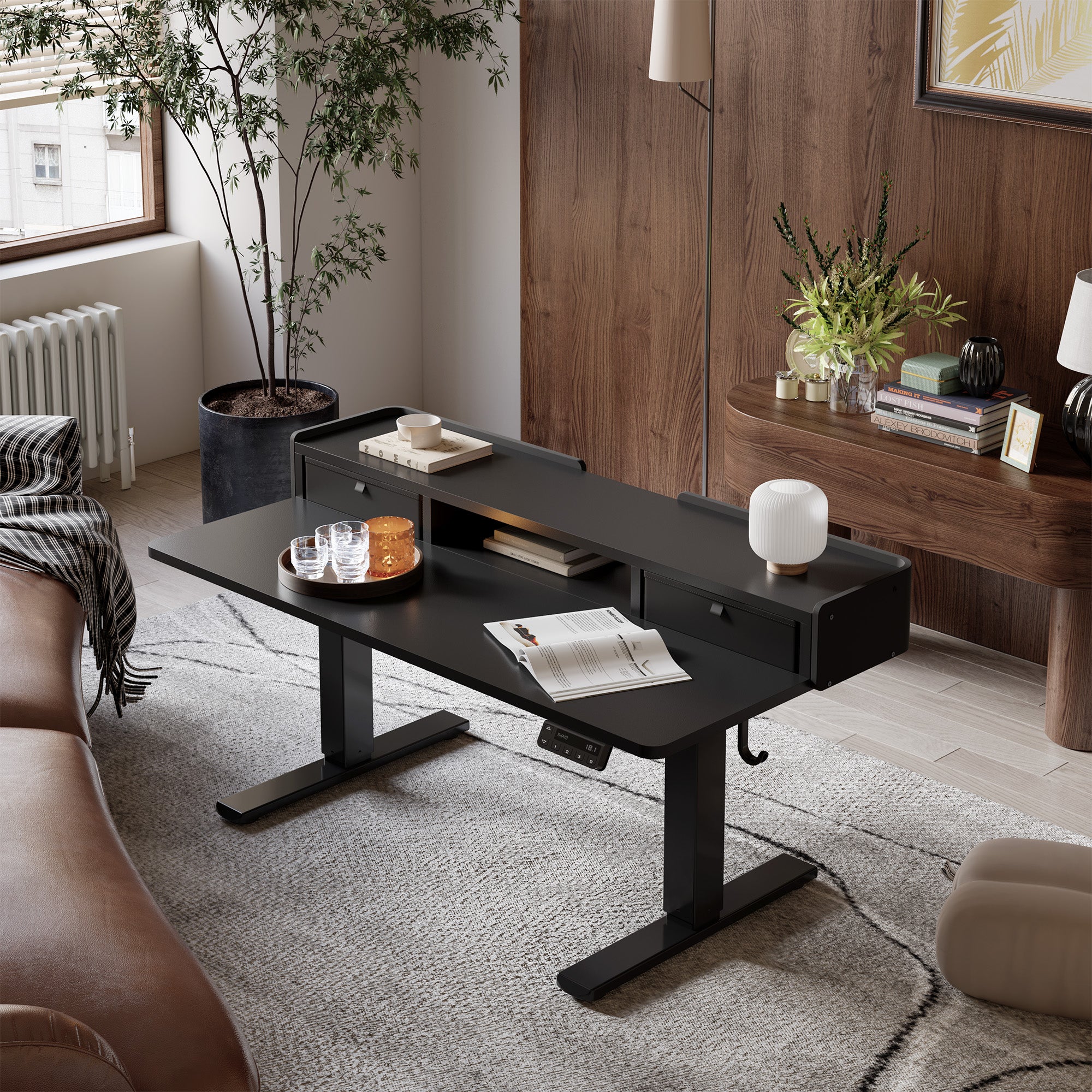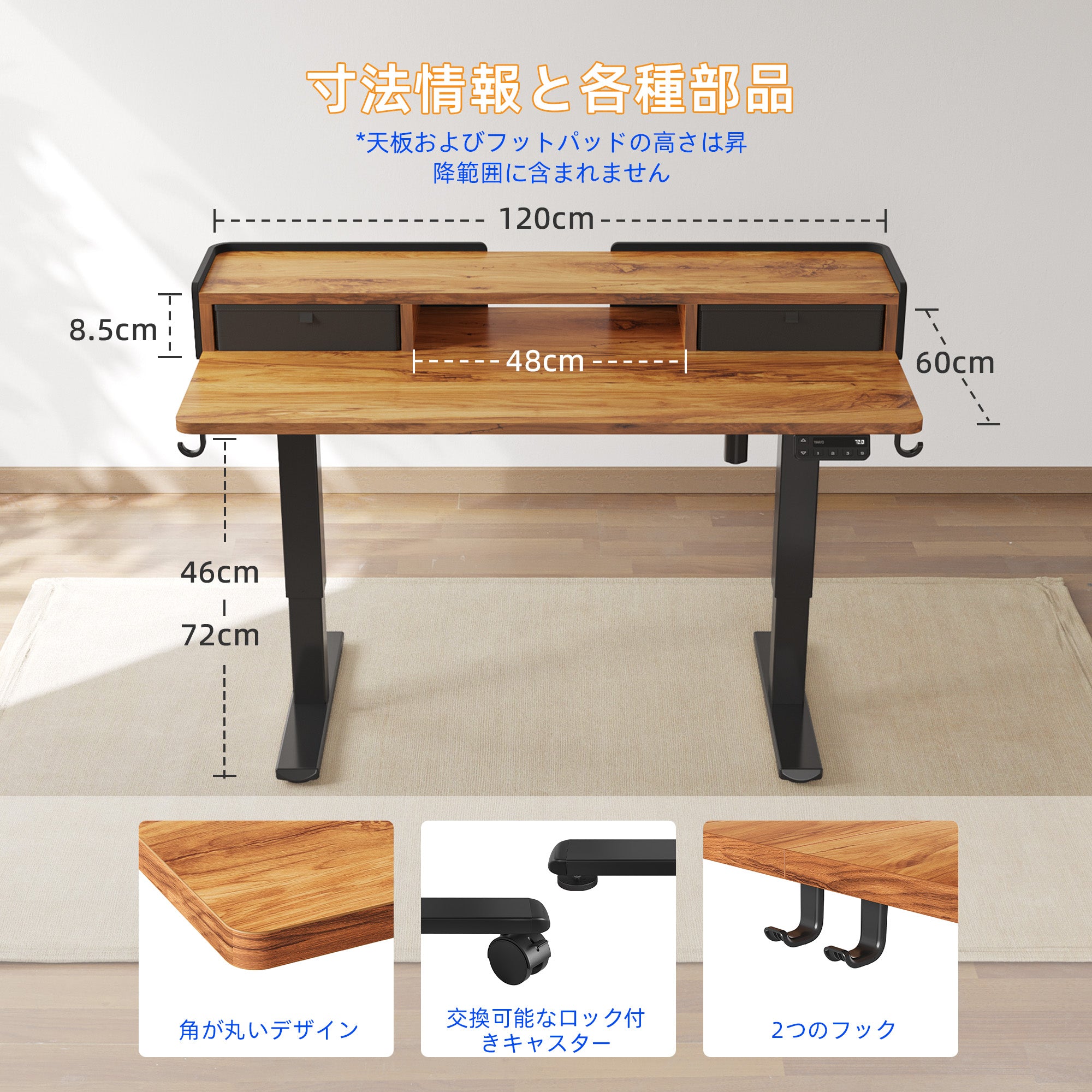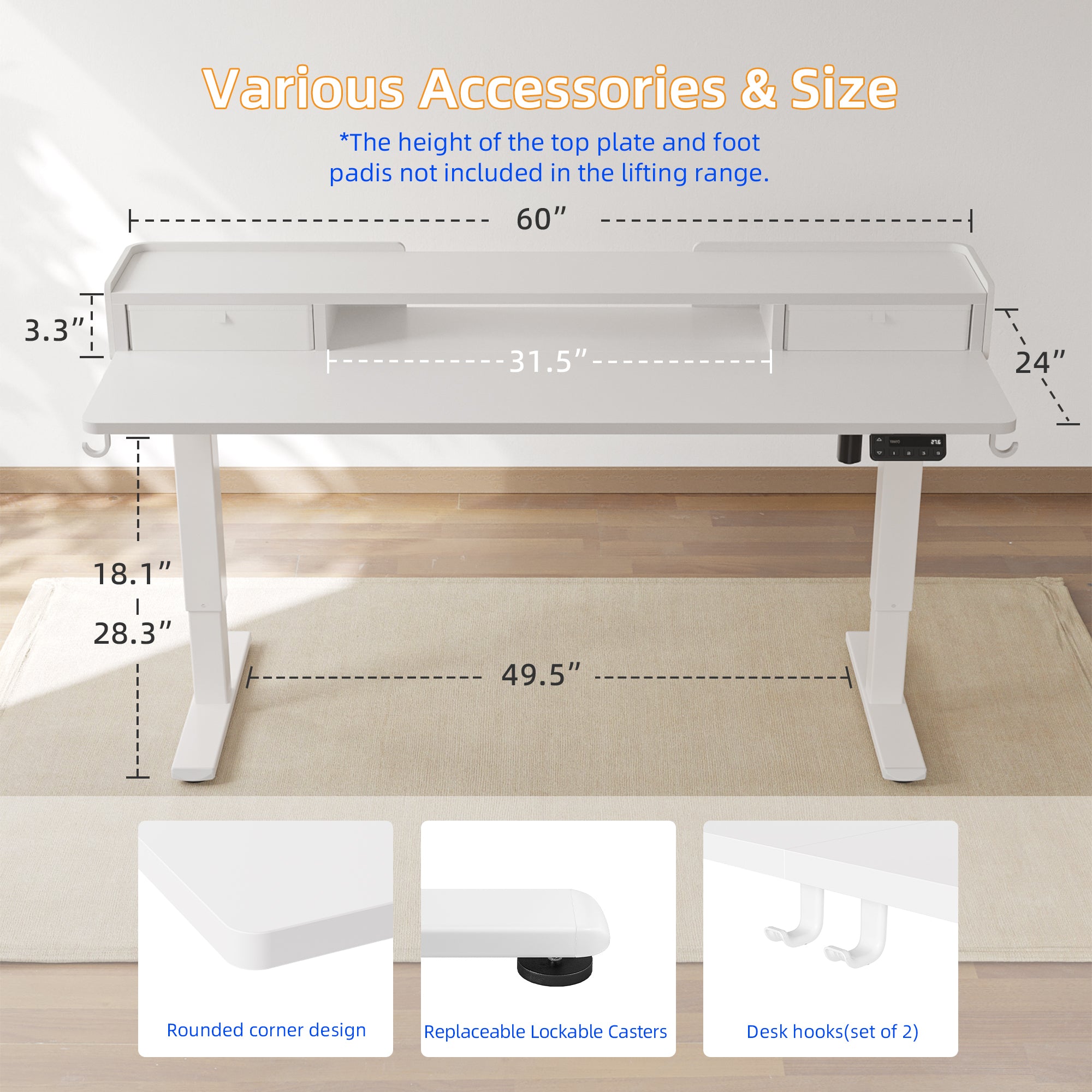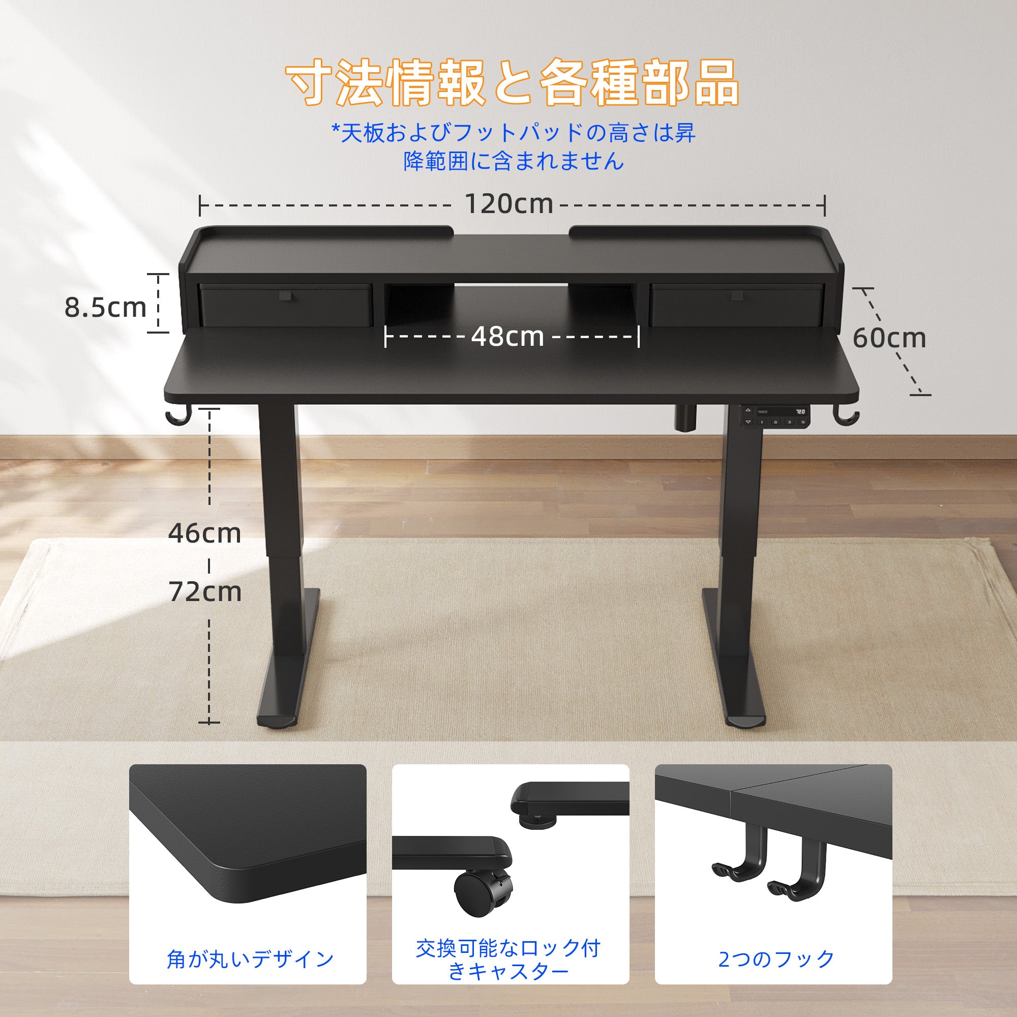 YIHAYO electric sit-stand desk has a monitor stand for your monitor and other devices, allowing you to keep your eyes parallel to the screen, helping to reduce neck and back pressure. Two fabric drawers provide ample storage space for your belongings, allowing you to store files, books, cables, etc., helping to keep your desk tidy and organized. This sit-stand desk is also equipped with a headphone hook and desktop cable storage hole to create an organized workspace.