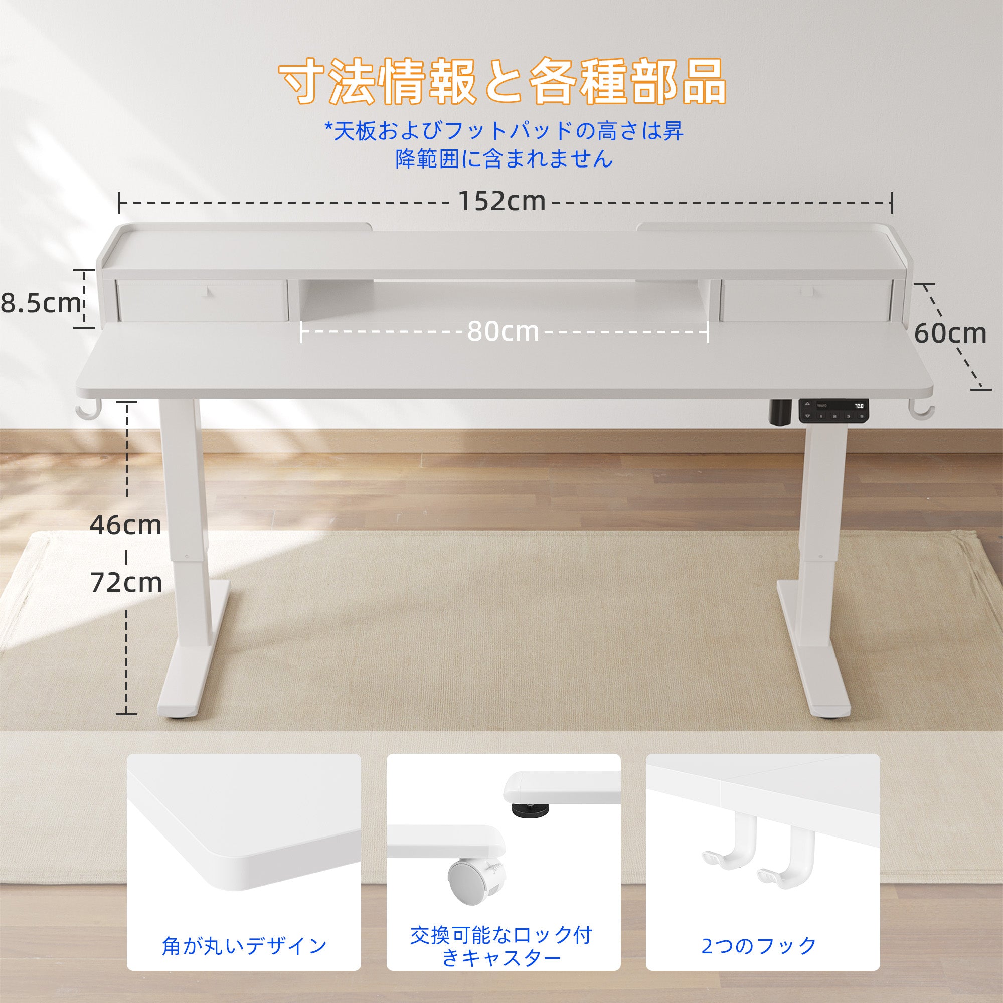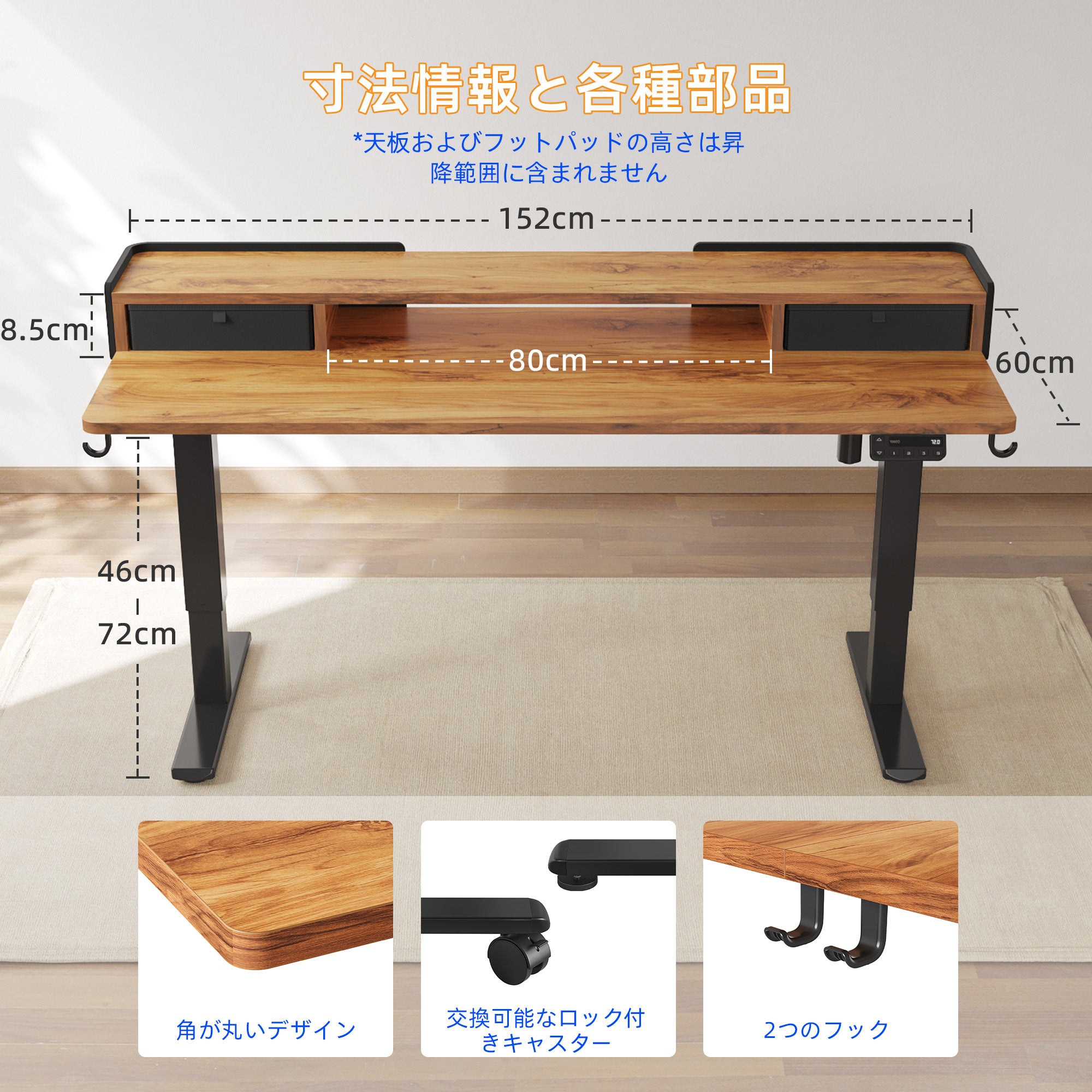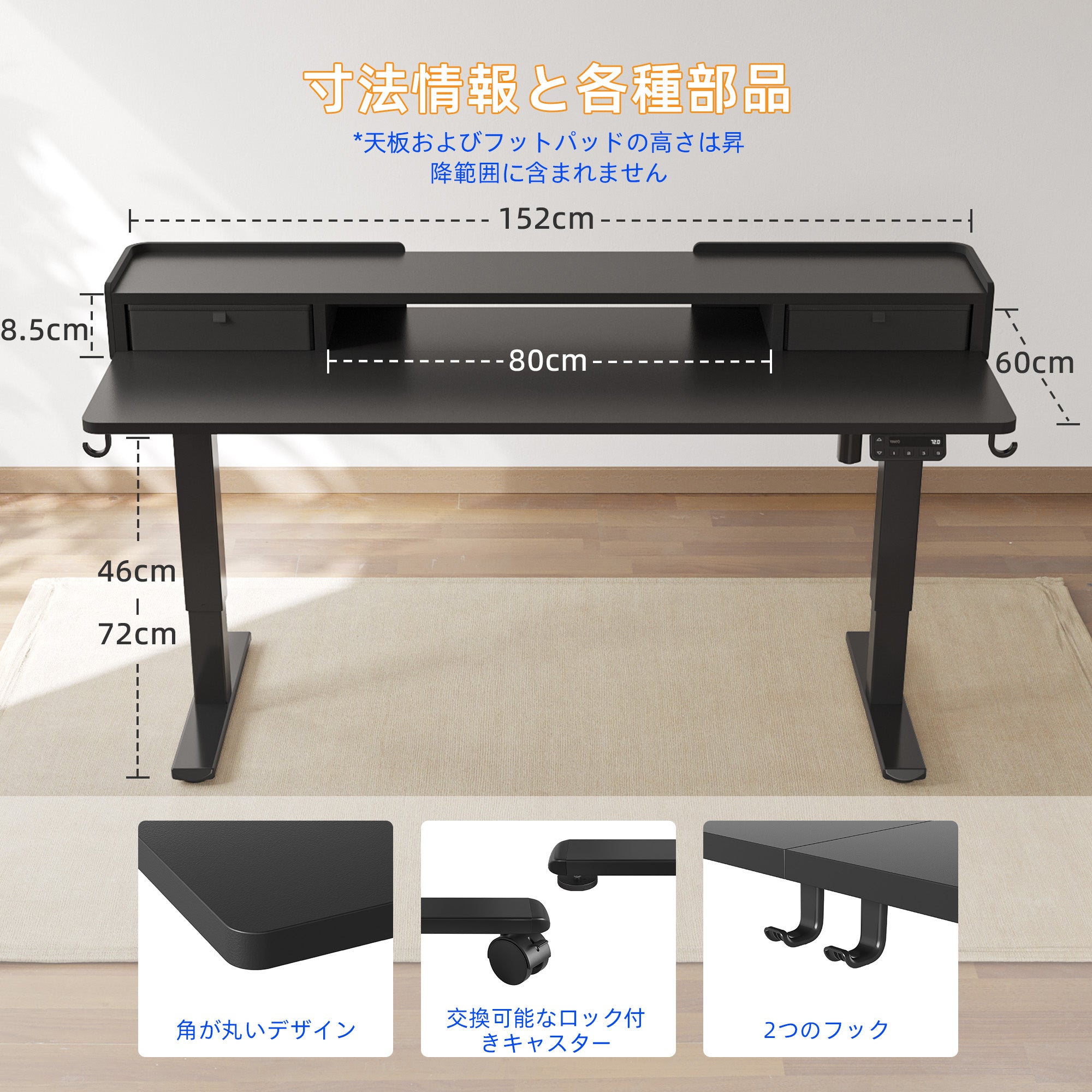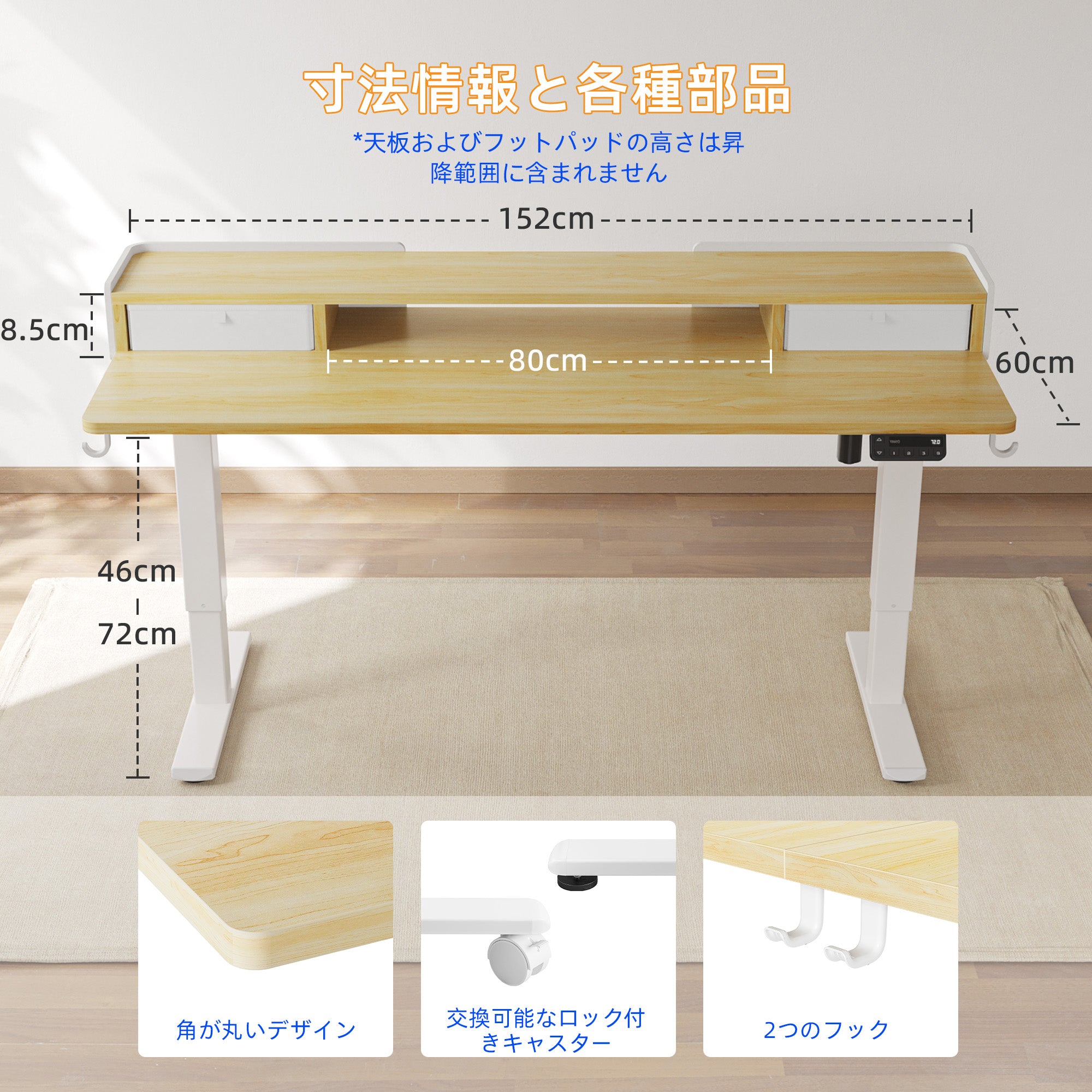 YIHAYO electric height adjustable desk provides a very spacious work surface of 152x60cm. With excellent load-bearing capacity and vertical lifting drive, the desktop has a load capacity of up to 70KG